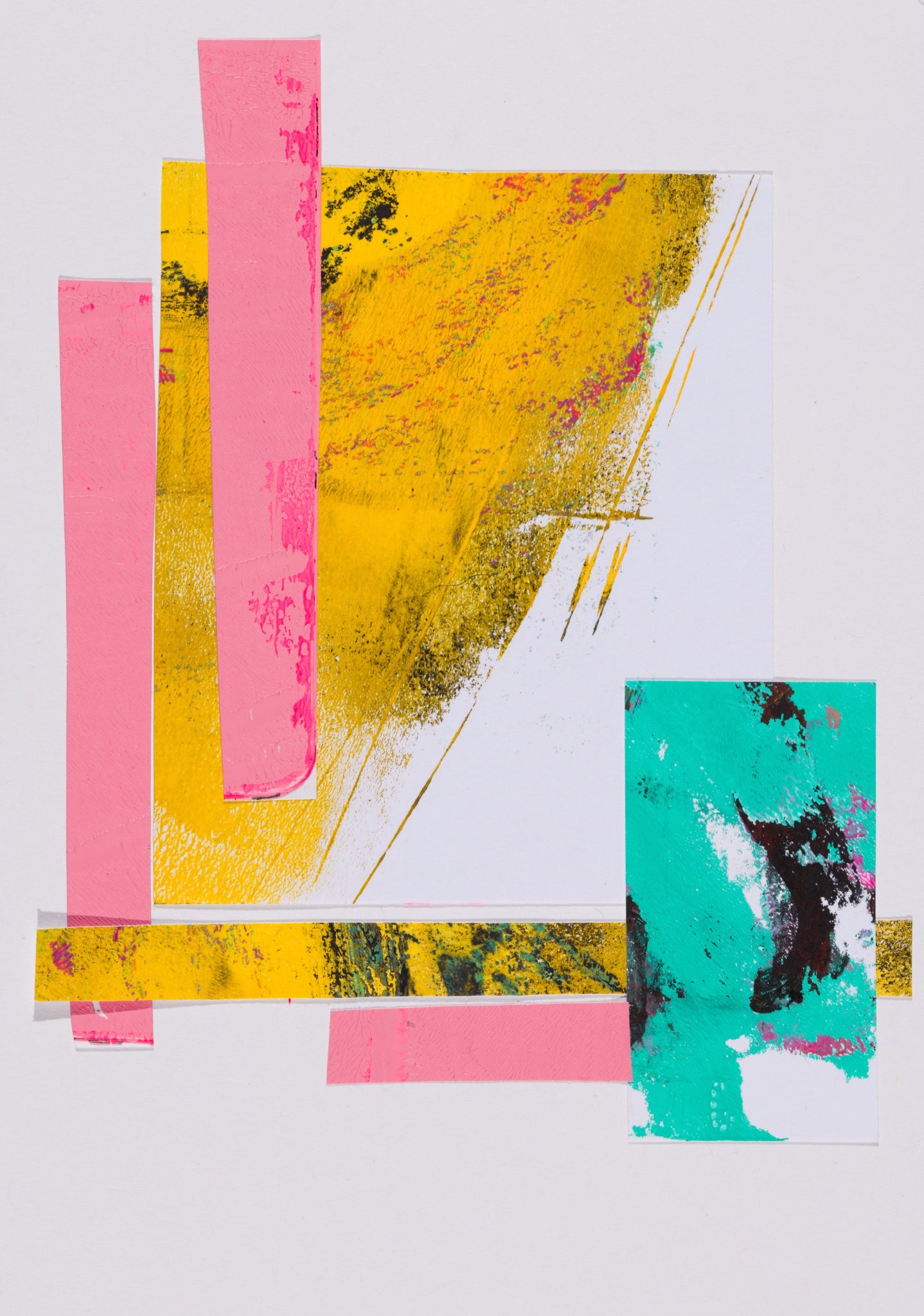 Part of a series of collages made from acrylic paint mono prints and inspired by improvisational quilting.
