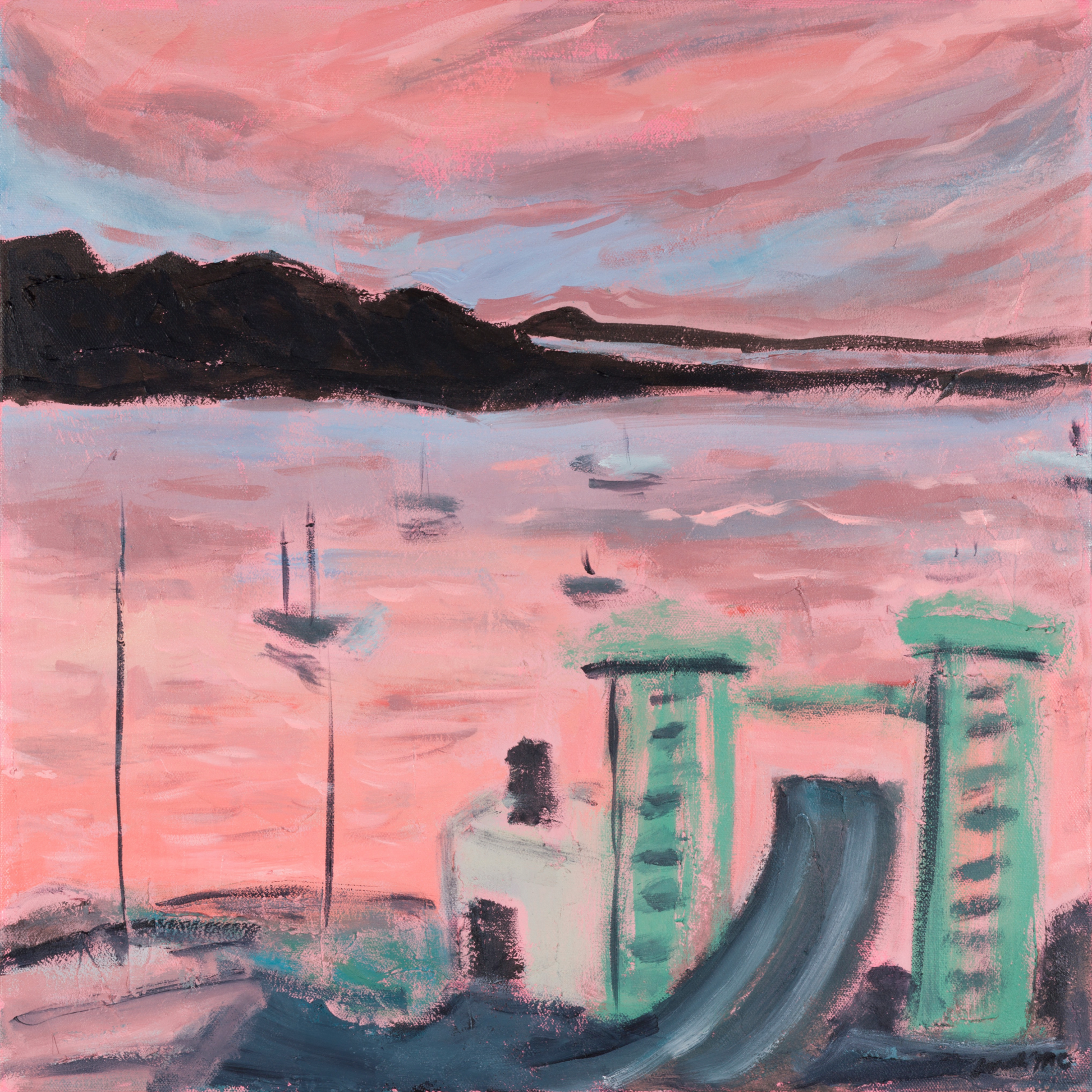 This is one of a series of paintings based on a single photograph that I took from the window of the Rockland Harbor Hotel in Rockland, Maine. Sunset had turned the ocean baby pink. I love the contrast of soft pinks and purples with industrial infrastructure.